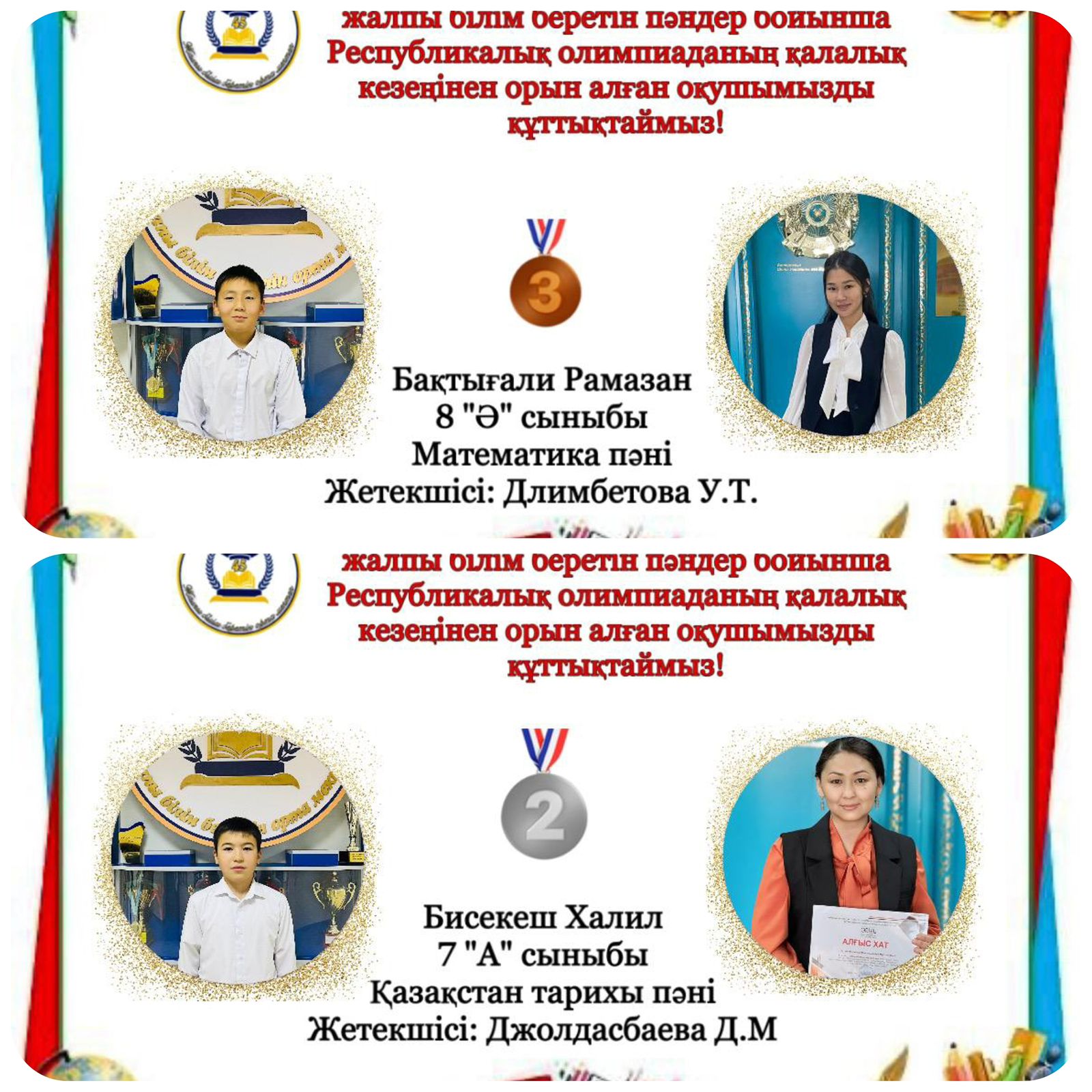 Желтоқсан айының 10-11 күндері №10 ЖББ орта мектеп базасында 7-8 сынып оқушыларына арналған жалпы білім беретін пәндер бойынша Республикалық пәндік олимпиаданың қалалық кезеңі өткізілді. Мектебімізден қалалық кезеңге 17 оқушы қатысты. Қорытындысы бойынша: