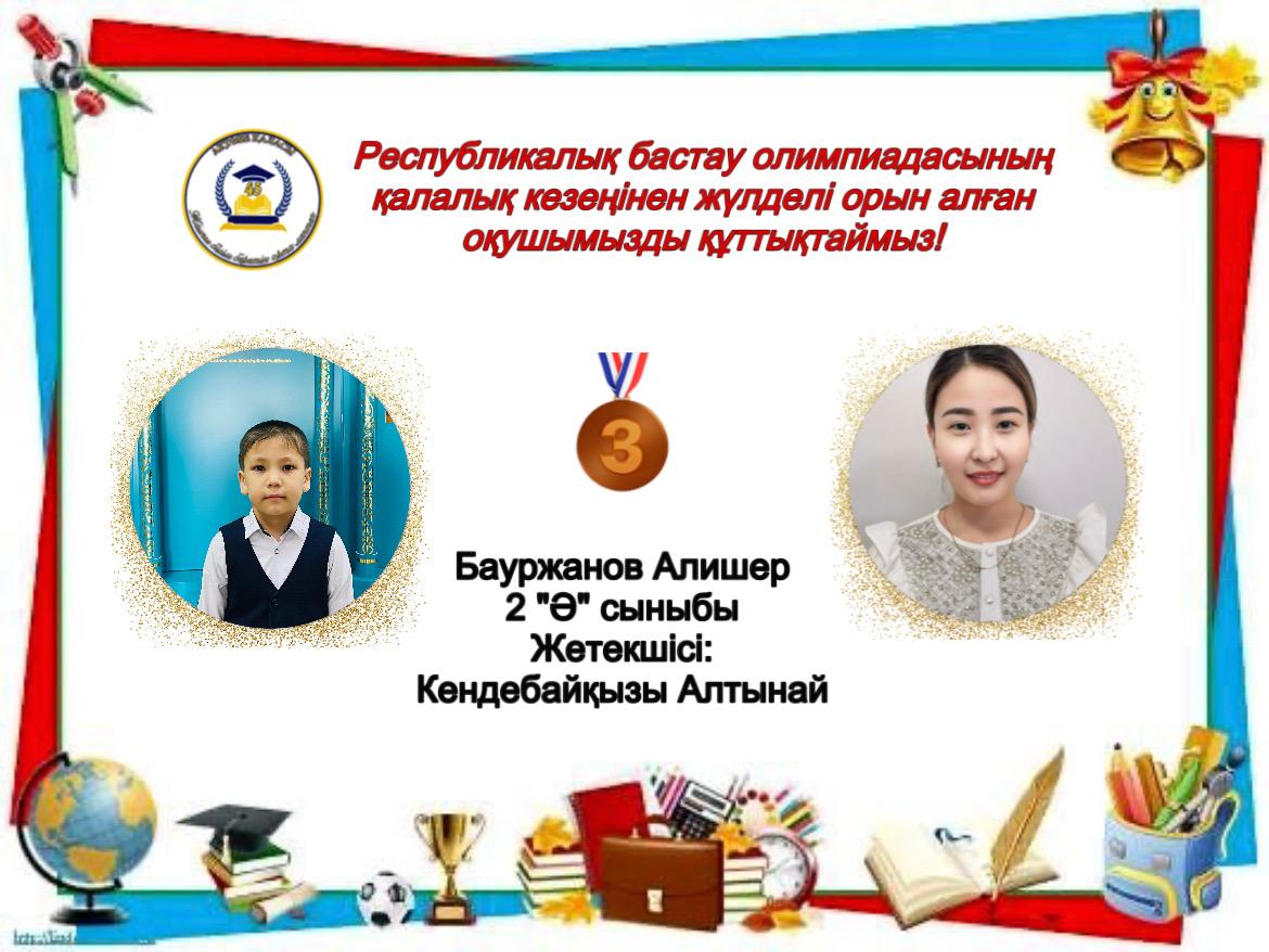 2 ә сыныбы - Бауржанов Алишер - ІІІ орын, жетекшісі Кендебайқызы А.