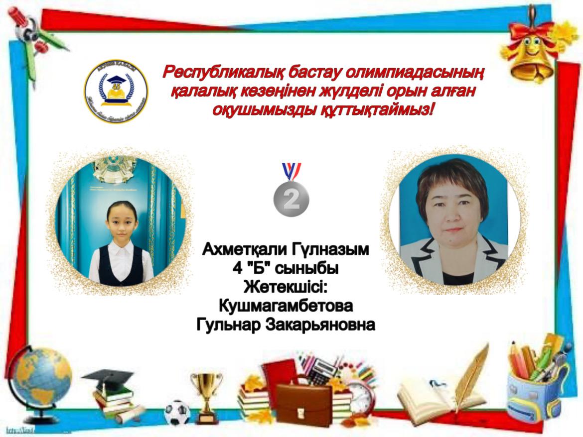 4 б сыныбы - Ахметқали Гүлназым - ІІ орын, жетекшісі Кушмагамбетова Г.З.