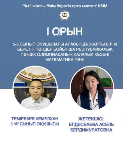 5 А сынып оқушысы Темірбаев Кемелхан І орын, математика пәні, жетекшісі Елдесбаева А.Б.