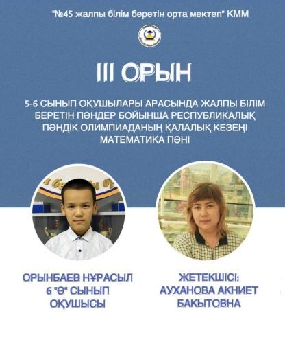 6 Ә сынып оқушысы Орынбаев Нұрасыл ІІІ орын, математика пәні, жетекшісі Ауханова А.Б.