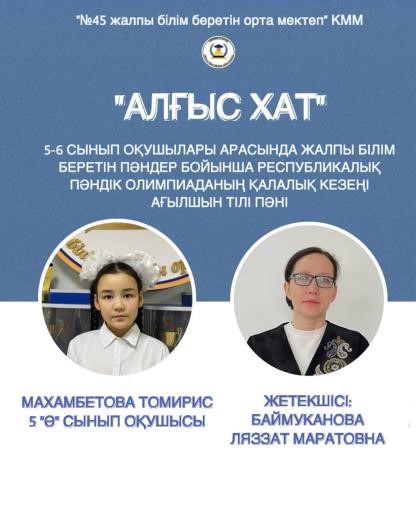 5 Ә сынып оқушысы Махамбетова Томирис “Алғыс хат”, ағылшын тілі пәні , жетекшісі Баймуканова Л.М.