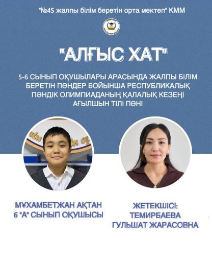 6 А сынып оқушысы Мұхамбетжан Ақтан “Алғыс хат”, ағылшын тілі пәні, жетекшісі Темирбаева Г.Ж.