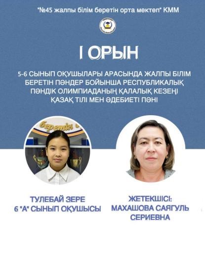 6 А сынып оқушысы Тулебай Зере І орын, қазақ тілі мен әдебиеті пәні, жетекшісі Махашова С.С.