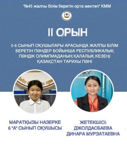 6 А сынып оқушысы Маратқызы Назерке ІІ орын, қазақстан тарихы пәні, жетекшісі Джолдасбаева Д.М.