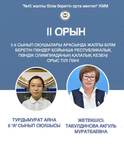 6 А сынып оқушысы Турдымурат Аяна ІІ орын, орыс тілі пәні, жетекшісі Табулдинова А.М.