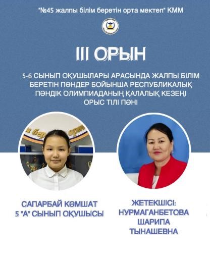 5 А сынып оқушысы Сапарбай Кәмшат ІІІ орын, орыс тілі пәні, жетекшісі Нурмаганбетова Ш.Т.
