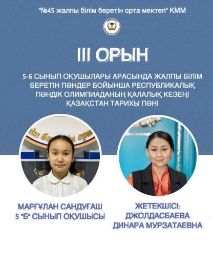 5 Б сынып оқушысы Марғұлан Сандуғаш ІІІ орын, қазақстан тарихы пәні, жетекшісі Джолдасбаева Д.М.