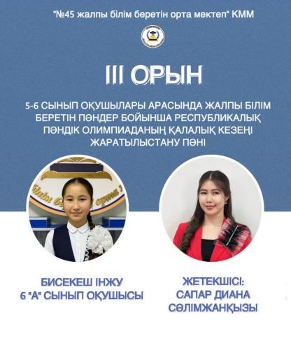 5 Б сынып оқушысы Мұратова Нұрайым ІІІ орын жаратылыстану пәні, жетекшісі Сапар Д.С.