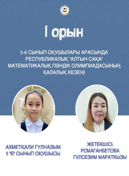 5 Б сынып оқушысы Ахметқали Гүлназым І орын, жетекшісі Рсмаганбетова Г.М.