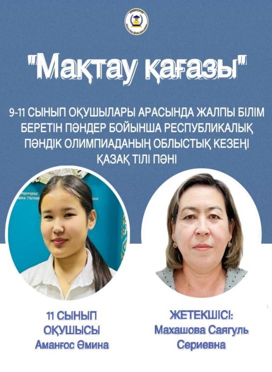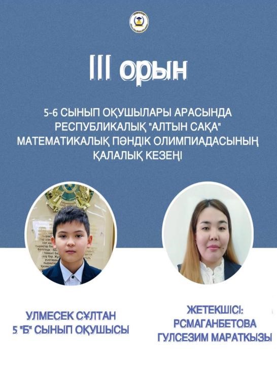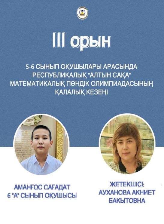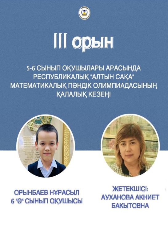 6 А сынып оқушысы Аманғос Сағадат ІІІ орын, жетекшісі Ауханова А.Б.