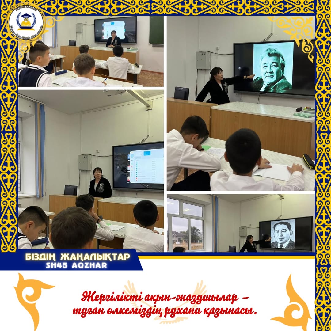 Жергілікті ақын жазушыларымыз туралы библиографиялық шолу ұйымдастырылды.Жергілікті ақын- жазушылар туған өлкеміздің рухани қазынасы. Олардың әрбір шығармасы тарихымыздың мәдениетіміздің айнасы. Өз өңіріміздің қаламгерлерін құрметтеу- болашққа қалдырған асыл мұраны бағалау. Жергілікті әдебиет- туған жердің жүрегінен шыққан жыр, рухымызды тербеткен сыр. Осы ақындарымыз туралы 7ә сынып оқушыларныа таныстырылды.Жергілікті ақын жазушыларымыз туралы библиографиялық шолу ұйымдастырылды. Жергілікті ақын-жазушылар – туған өлкеміздің рухани қазынасы. Олардың әрбір шығармасы – тарихымыздың, мәдениетіміздің айнасы. Өз өңіріміздің қаламгерлерін құрметтеу – болашаққа қалдырған асыл мұраны бағалау. Жергілікті әдебиет – туған жердің жүрегінен шыққан жыр, рухымызды тербеткен сыр. Осы ақындарымыз туралы 7ә сынып оқушыларына таныстырылды.