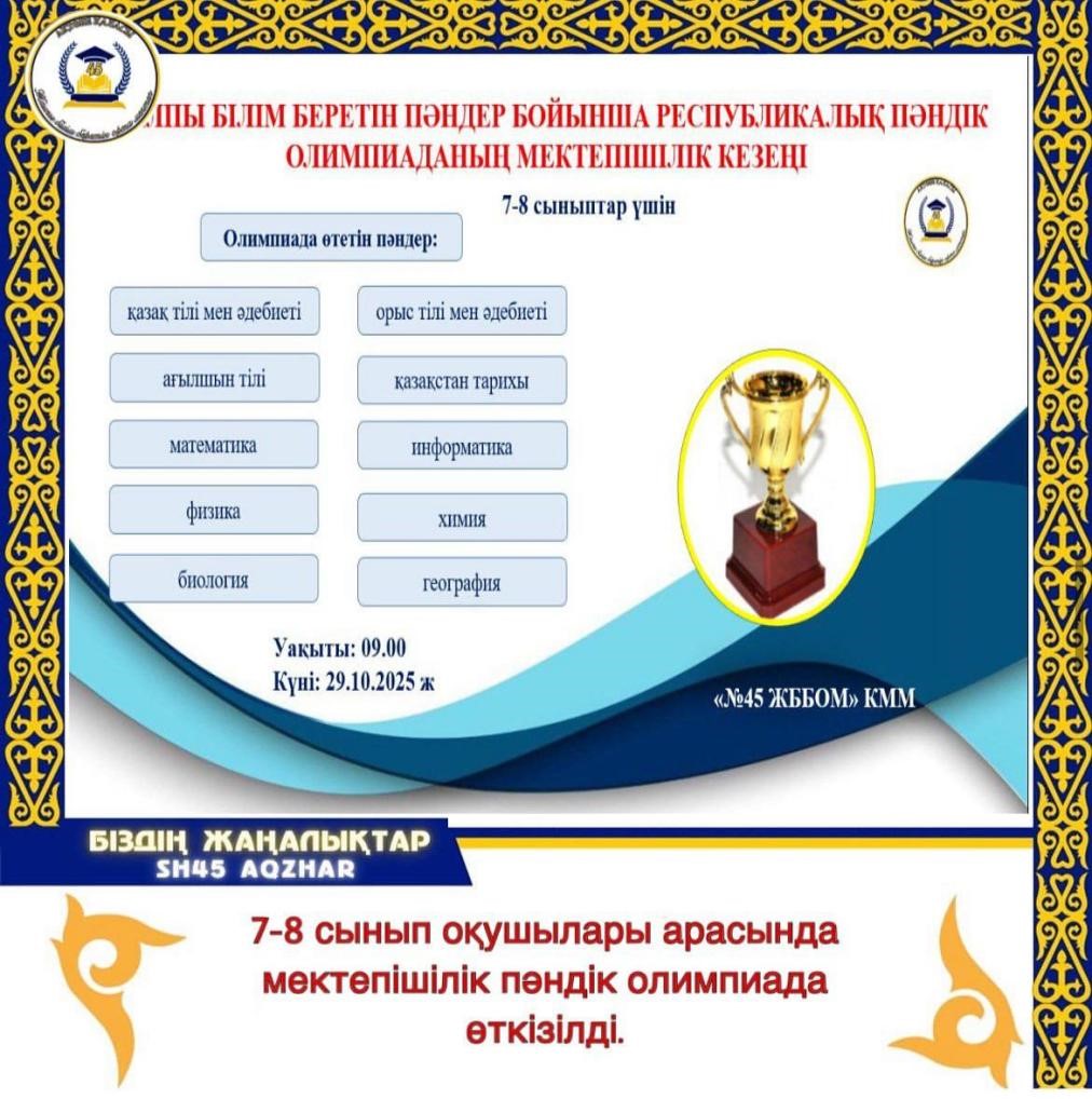 Қазан айының 29-ы күні мектебімізде 7-8 сынып оқушылары арасында жалпы білім беретін пәндер бойынша Республикалық пәндік олимпиаданың мектепішілік кезеңі өткізілді.