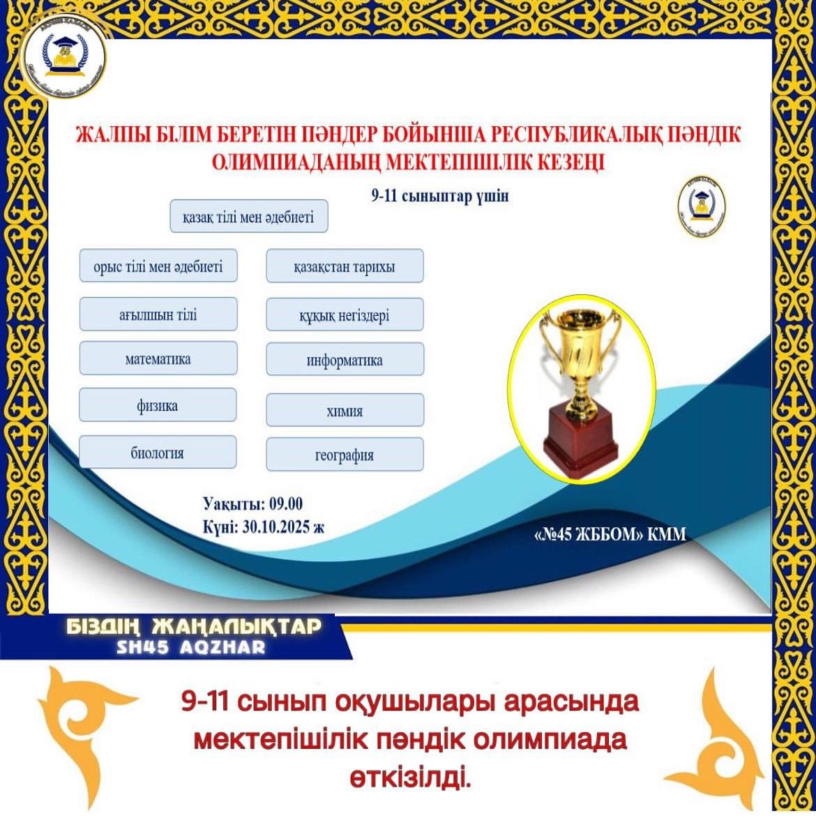 Қазан айының 30-ы күні мектебімізде 9-11 сынып оқушылары арасында жалпы білім беретін пәндер бойынша Республикалық пәндік олимпиаданың мектепішілік кезеңі өткізілді.