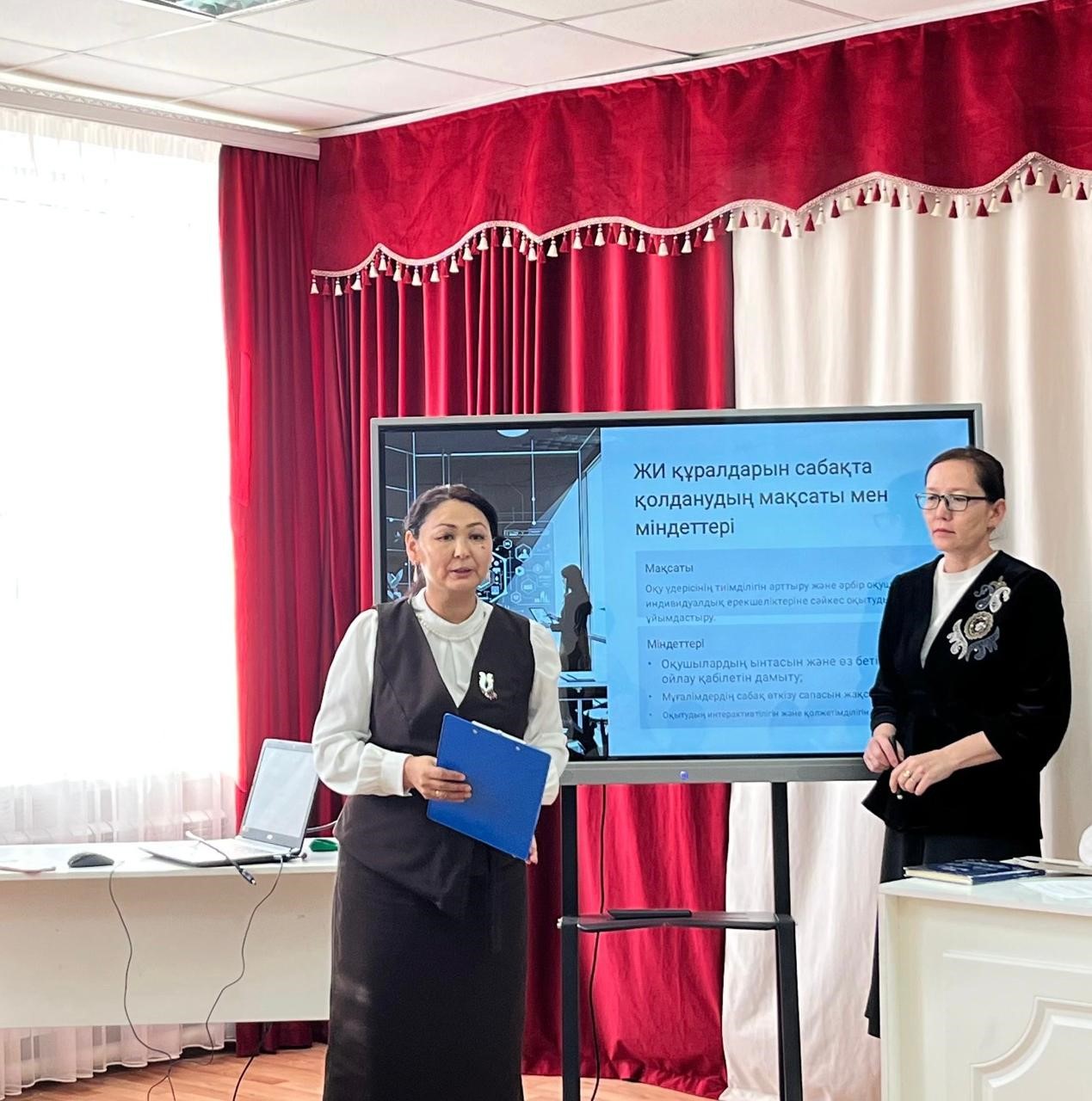 Әдістемелік бірлестік отырыстарында ЖИ тақырыптары қаралды, гуманитарлық пәндер әдістемелік бірлестігі «Жасанды интеллект құралдарын сабақта қолдану жолдары» тақырыбында, жаратылыстану бірлестігінде «Информатика сабақтарында жасанды интеллект қолдану» тақырыптарында бірлестік мүшелеріне тәжірибемен бөлісті.